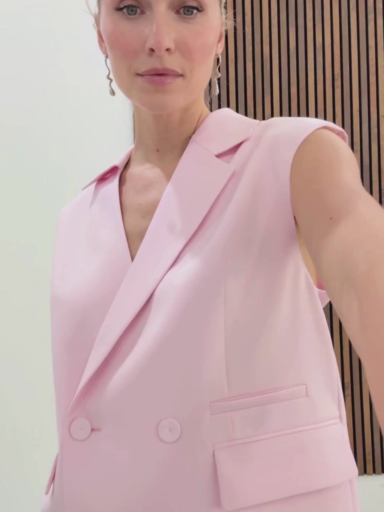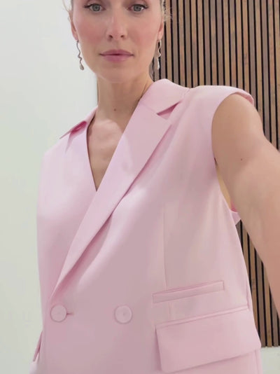 The Lilia Vest in delicate lilac impresses with its modern, sleeveless design featuring striking shoulder pads and a relaxed fit. This double-breasted vest makes a fashion statement with its asymmetrical lapel and collar and is perfect for a progressive layered look.